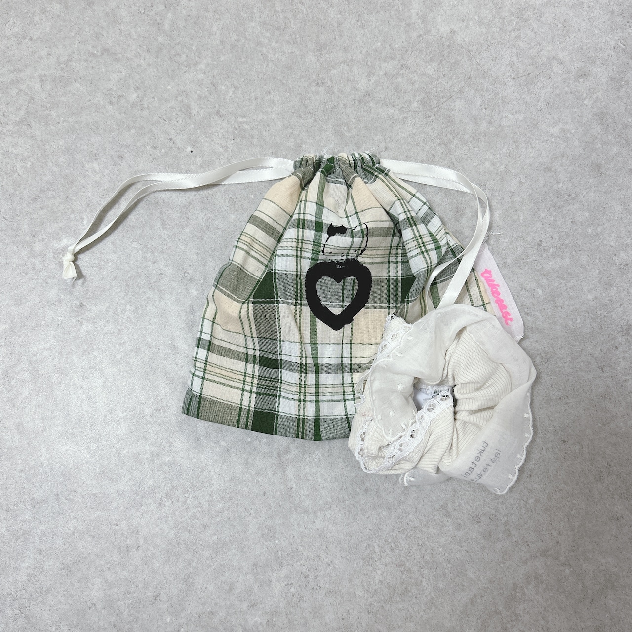 今回製作した生地のかわいいを残しておいて繋ぎ合わせたシュシュと巾着にはシルクプリントしたにゃんにゃん付きSETです。