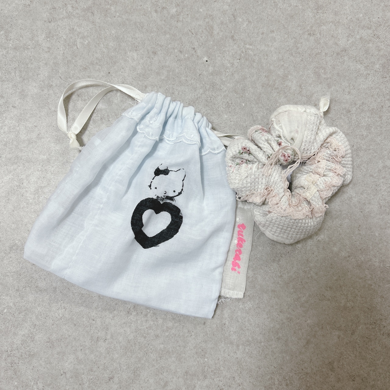 今回製作した生地のかわいいを残しておいて繋ぎ合わせたシュシュと巾着にはシルクプリントしたにゃんにゃん付きSETです。