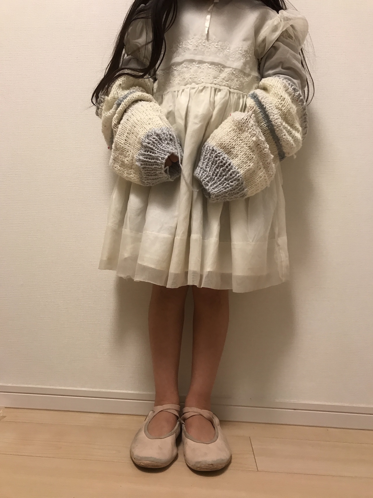 棒編みで編んだarm warmerになります。一緒についてる洗濯バサミで挟んで首に少し巻けます♡