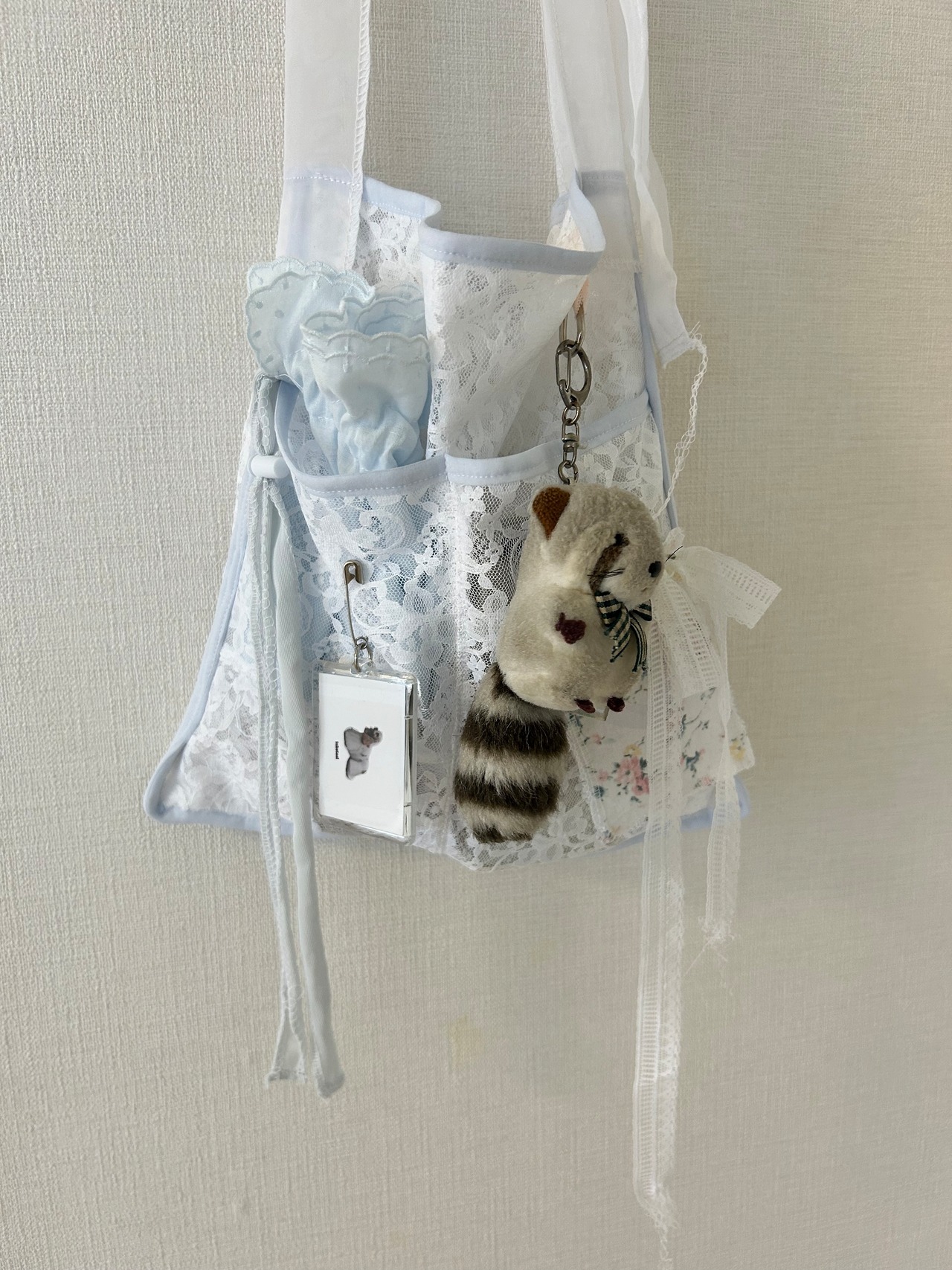 肩紐がリボンになっていて長さが調整できるpinkとlaceのbagになります。ウォールポケットみたいにいろんなとこに収納できます。