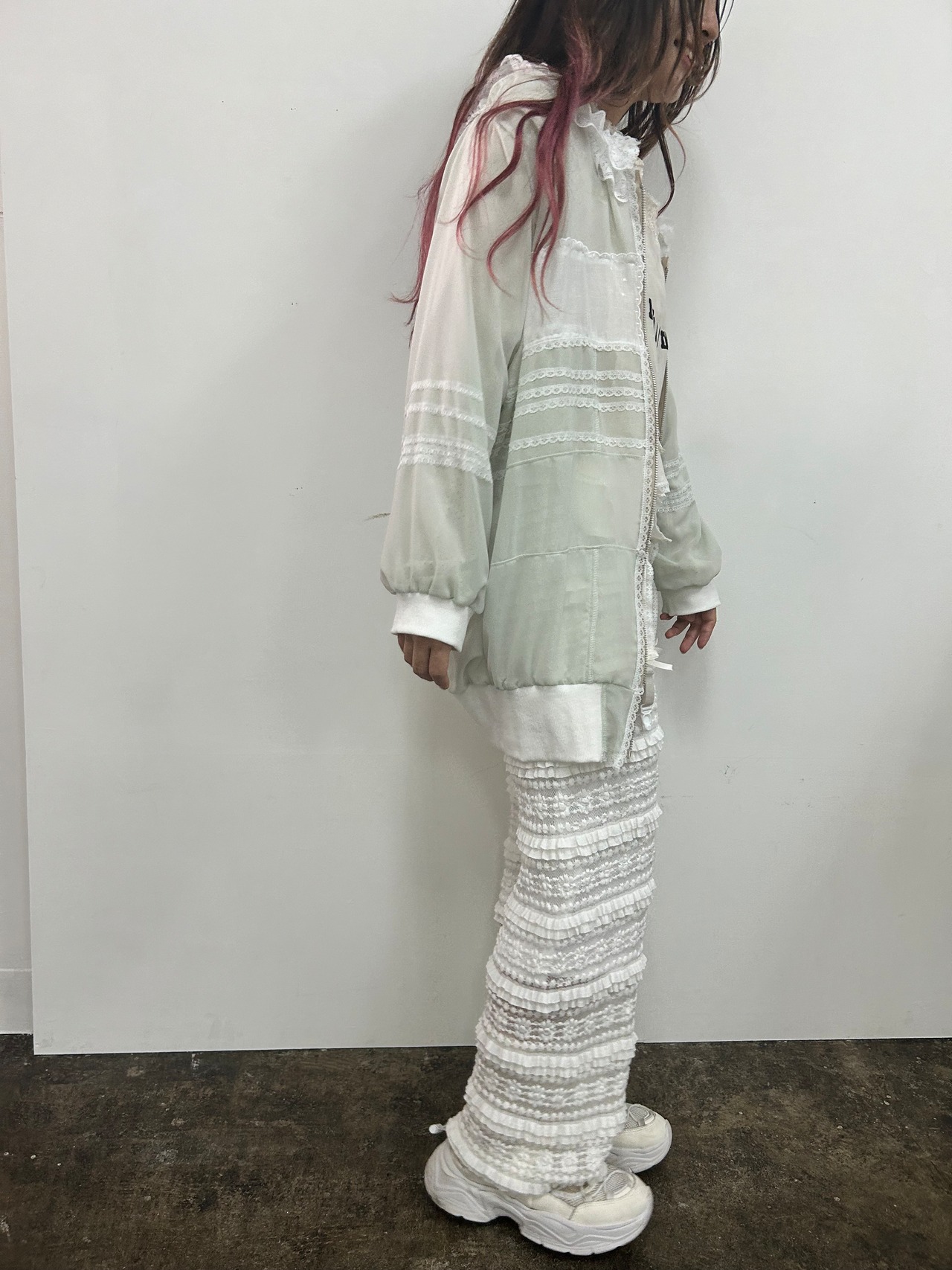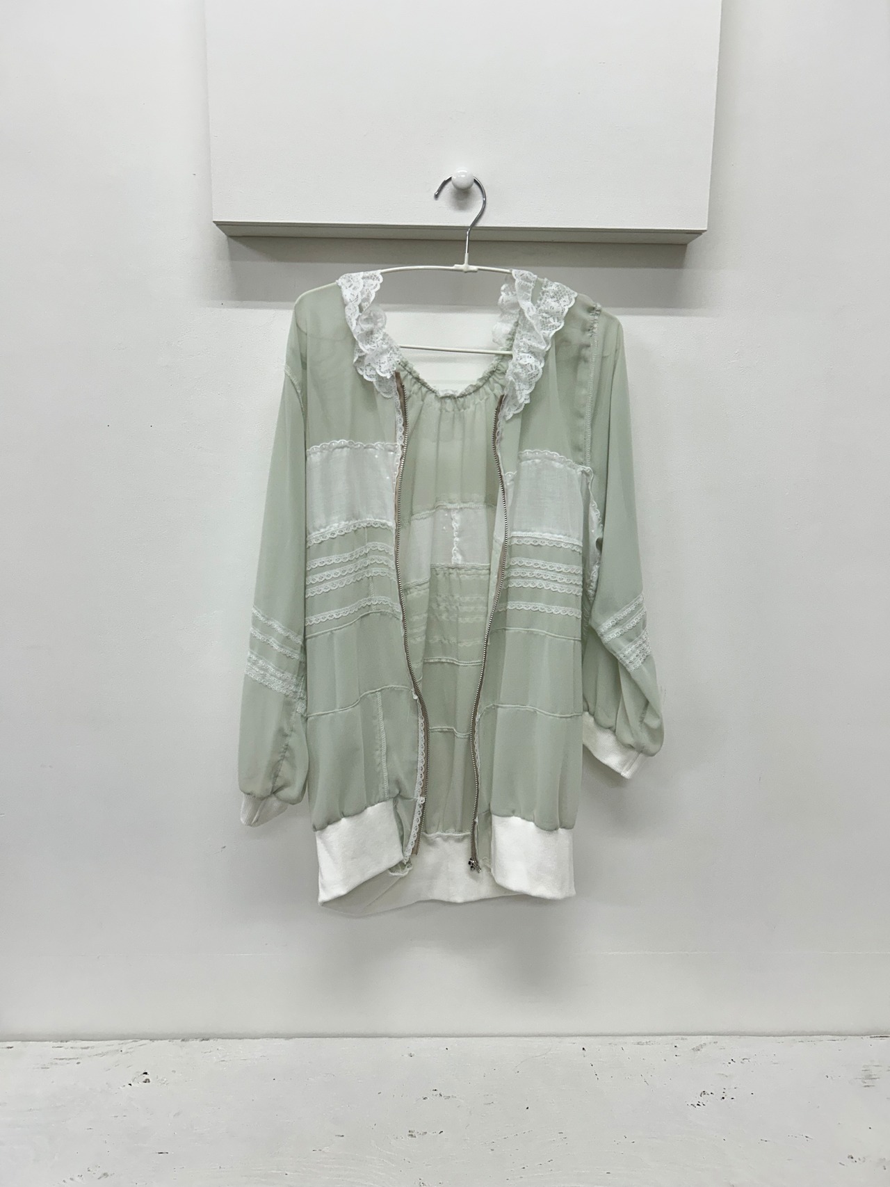シアー素材のミントグリーンの生地を使った羽織になります。いろんな素材のレースで模様を作ったりハンカチやフリルが使われてます。お尻が隠れる長さでシルエットも◯
